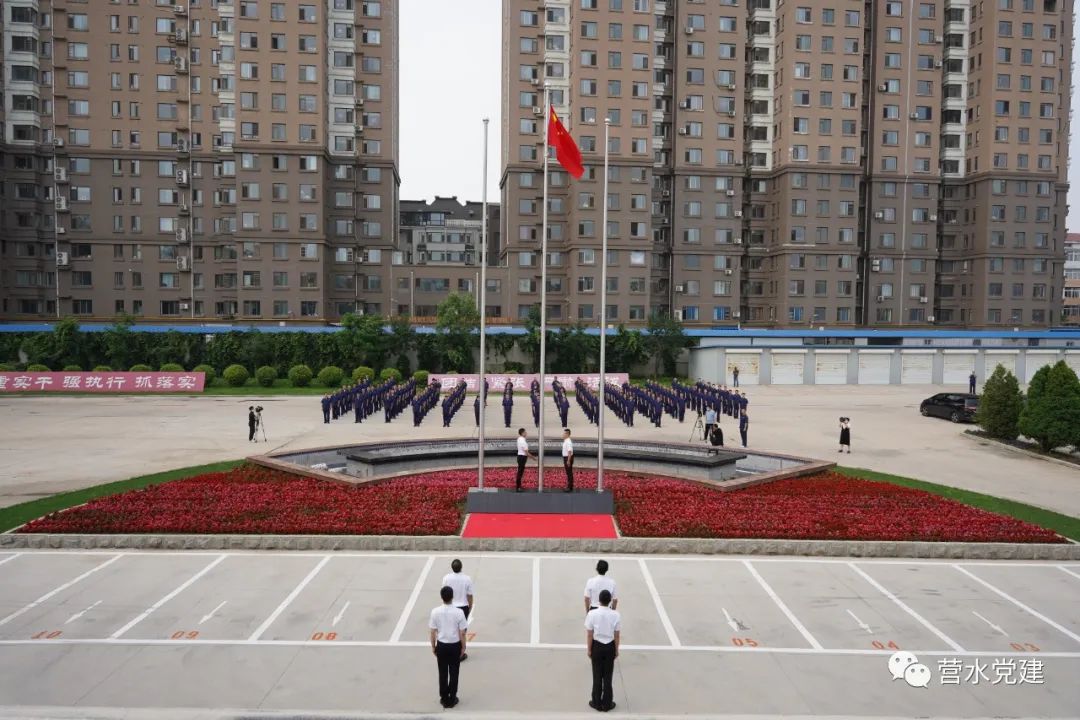 全體黨員整齊著裝,在辦公樓前列隊(duì),英姿颯爽的護(hù)旗手邁著鏗鏘有力的步伐,托舉五星紅旗走向升旗臺(tái)。